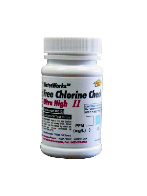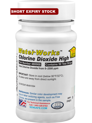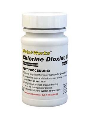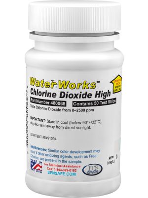 WaterWorks Chlorine Dioxide High Range water quality test strips have a very high range of detection with a patented indicator. With no bleaching of the indicator, even at high levels, the WaterWorks Chlorine Dioxide High is the ideal product when testing ClO2 sanitizing and disinfecting solutions. No external chemicals are needed to perform the water quality test.