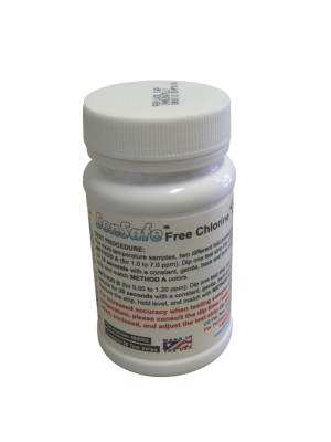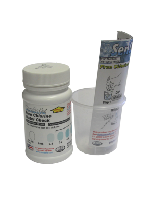 Free chlorine water check, USEPA approved. No interference from chloramines (TMB procedure). Sensitivity down to 0.05 ppm using Aperture strip. Bottle of 50 strips. 0, 0.05, 0.1, 0.2, 0.4, 0.6, 0.8, 1.2, 1.5, 2, 2.6, 4, >6 ppm